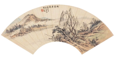 相比別的畫作,陸小曼的扇畫尤為精致,深受當(dāng)時名士們的喜愛。在一幅陸小曼于1943年所畫的《柳蔭垂釣圖》中,一只帶篷的小船靜靜地泊在湖上,隱者面對青山悠然垂釣,岸邊柳絲垂拂、柔情似水。畫面似一幅素雅的綢緞,營造出一種靜謐清幽的情趣,意境清遠(yuǎn)蕭疏。用筆輕而松,墨色簡淡卻無纖細(xì)浮薄之感,以淡墨簡筆有神地籠罩住整個畫面,可謂天真幽淡。畫中那種書卷之氣,深深地感染著我們,這也正是她的作品個人魅力之所在。