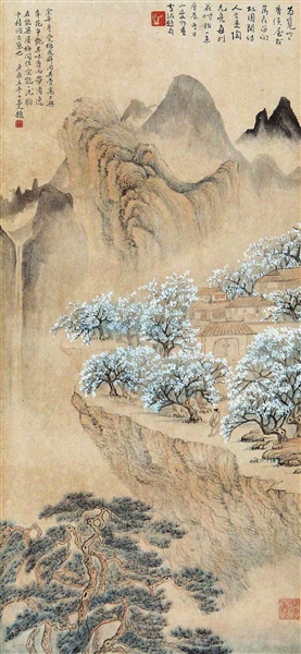 陸小曼致力于研究元代倪云林、明代沈周、清代王鑒等大師的作品,她的畫作也形成了文人畫的風(fēng)格,賦色清麗雅致,格調(diào)脫俗,潤澤秀麗。在她的《梅屋圖》上,隱士在深山幽谷中欣賞耀目的白梅,詩意盈滿,幽趣盎然。整幅畫面古樸幽雅、清新悅目。小曼在畫上自題有“余生平愛梅成癖,因其骨高不與群花爭艷,其味香而清逸。若能筑屋梅間住,定能一洗胸中積悶之氣也?!绷碛挟嫾覍O雪泥題句為:“為覓空香繞屋栽,萬花留向故園開。詩人合是陶元亮,每到花時始一來?!泵罹涮聿?,可謂恰合畫意。