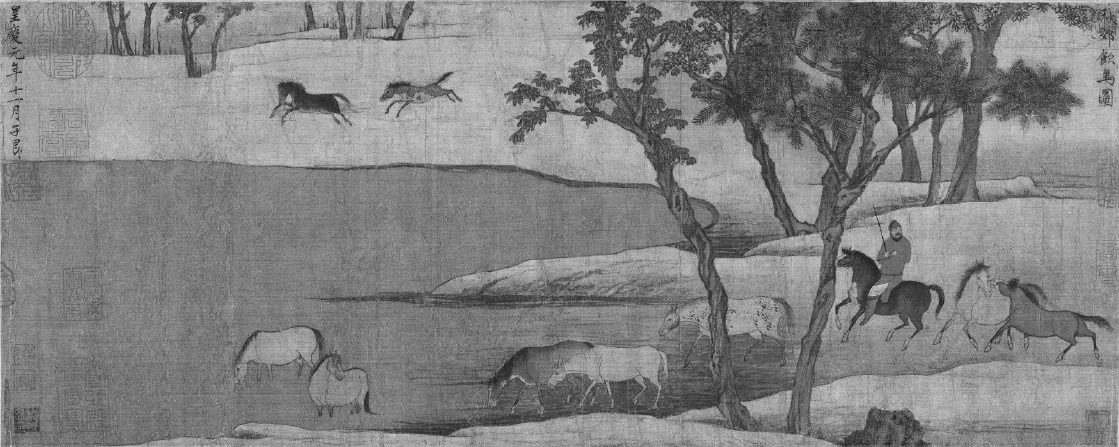 趙孟頫,《秋郊飲馬圖》卷,絹本,設(shè)色,縱23.6厘米,橫59厘米,故宮博物院藏