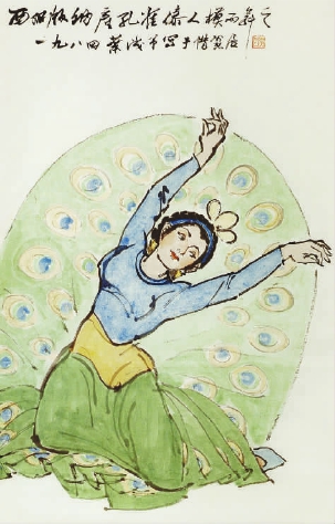 偶有機會,葉淺予得以客居張大千家中兩月,期間兩人切磋交流繪畫。葉淺予回憶當(dāng)時的場景時說道:“連續(xù)在他畫案旁站了一個多月,學(xué)到了不少手上的功夫。 ”葉淺予在張大千處得見其所摹的晉唐時期中國傳統(tǒng)佛教敦煌壁畫,更加領(lǐng)略了傳統(tǒng)繪畫藝術(shù)的魅力,獲得傳統(tǒng)人物畫的筆墨靈感,移用于他的印度舞畫,使作品實現(xiàn)了新內(nèi)容與新的藝術(shù)表現(xiàn)形式的高度統(tǒng)一,豐富了其中國畫人物畫的內(nèi)涵和意境。這一時期,葉淺予畫的印度舞作品設(shè)色凝重,線條工整,頗有壁畫之風(fēng)。