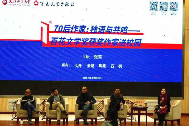 70后作家是一個(gè)不事喧嘩的堅(jiān)實(shí)、成熟的群體,成長(zhǎng)過(guò)程經(jīng)歷了改革開放前后不同的社會(huì)形態(tài),紛繁的變遷與涌動(dòng)的思潮使他們對(duì)于自我和文學(xué)的認(rèn)知都明顯不同于新時(shí)期作家和“80后”作家。無(wú)論詩(shī)歌、散文還是小說(shuō)創(chuàng)作,70后作家都顯現(xiàn)出一種冷靜而沉郁的氣質(zhì),并表現(xiàn)出越來(lái)越強(qiáng)烈的時(shí)代關(guān)懷和現(xiàn)實(shí)書寫,積極探索個(gè)人敘事與時(shí)代精神的融通與契合,向著歷史與人性深處不斷掘進(jìn),成為青年作家的中堅(jiān)力量。2017年12月6日,獲得第十七屆百花文學(xué)獎(jiǎng)的四位70后作家葛亮、張楚、弋舟、石一楓走進(jìn)天津師范大學(xué),與在校師生進(jìn)行了一場(chǎng)主題為“70后作家:獨(dú)語(yǔ)與共鳴”的對(duì)談,共同研討70后寫作者的精神際遇與美學(xué)追求,分享個(gè)人寫作歷程。對(duì)談?dòng)商旖驇煼洞髮W(xué)文學(xué)院教授張莉主持。