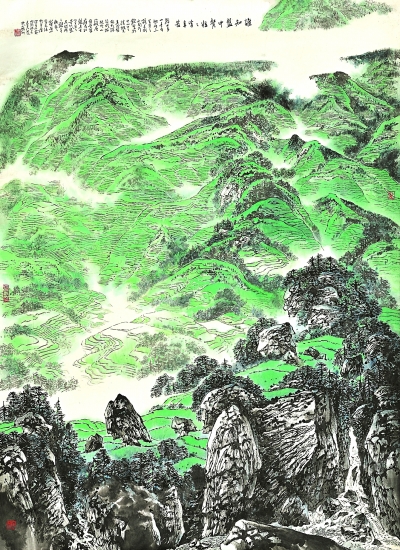 孫君良的中國(guó)畫(huà)《誰(shuí)知盤(pán)中餐 粒粒皆辛苦》描繪的是黔中山野梯田。風(fēng)格上看仍是清新遠(yuǎn)逸的園林山水,但畫(huà)家細(xì)細(xì)描繪一層一層的梯田,無(wú)論筆法還是題跋中,都飽含對(duì)人民生活的深情、對(duì)山水新貌的關(guān)注。