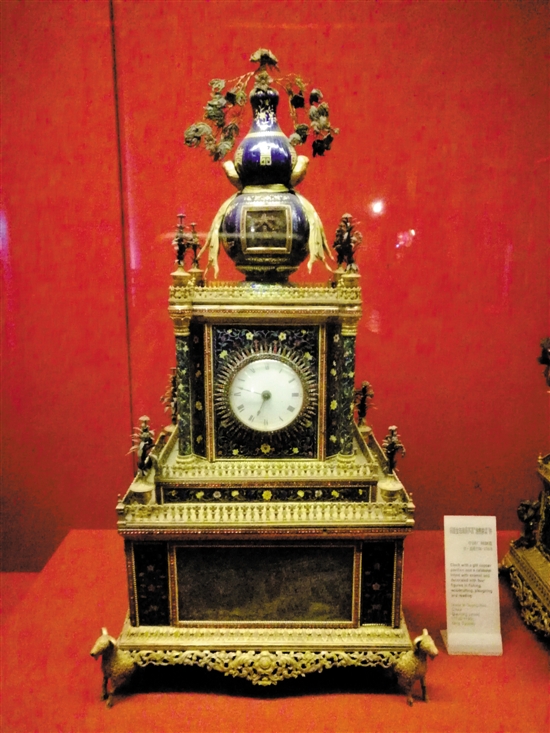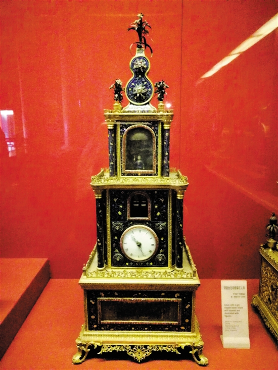 黃慶昌:從現(xiàn)存廣鐘藏品來看,廣州鐘表最為突出的一個特點,是其表面多為色彩鮮艷的各色琺瑯。廣鐘掐絲琺瑯的特點是掐絲生動,釉色鮮艷,其中以寶藍(lán)琺瑯貼金片最為突出,最為富麗堂皇。這種貼金銀花的硬透明琺瑯只有廣州能生產(chǎn),所以稱“廣琺瑯”。