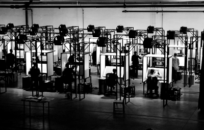 為了解決這些復雜的問題,制作團隊開發(fā)了名為PAWS(Painted Animation Work Stations)的工作站系統(tǒng),它包含了相機、電腦、投影、監(jiān)視器、光源和畫布等。每位參與的畫師都經(jīng)過了短期的培訓,有一個開放的相對獨立的小格子間工作站,既可相互交流,又能互不打擾。之前由演員實景拍攝、數(shù)字繪景所創(chuàng)建的動畫視頻作為參考物布置在畫布上方,或者投影在畫布上。畫師能夠更加專注于繪畫本身,一幀接一幀地畫下去。重復繪制的數(shù)量視很多情況而定,比如鏡頭的運動、人物的數(shù)量、運動的形式等,精確地控制每一幀的精度。最后,后期制作人員將油畫師們繪制的油畫通過電腦合成,制作成風格統(tǒng)一的油畫電影。