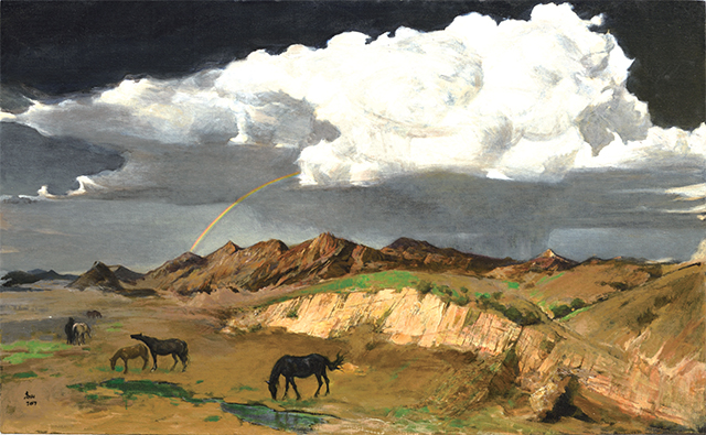 詩:“霍去病的戰(zhàn)馬/放歸了南山/英雄們的豪氣/還騰在云端/西部的風景/少不了漢唐的色調/西部的畫家/都勇于西出陽關?!?/p>