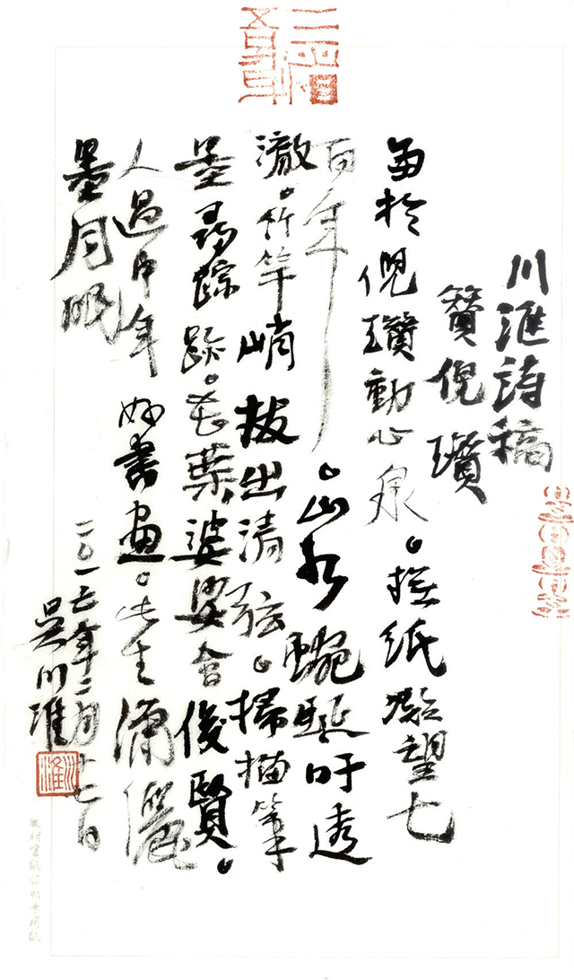 此次展覽的展名由文博家陳鵬舉題簽。年近九旬的書法家、詩人謝云題賀:“賞雨茅屋,君其芬芳,書畫自語,揮灑綿長。”展覽開幕式上,吳川淮向中華慈善總會(huì)“明天會(huì)更好”慈善愛心基金捐贈(zèng)了自己的作品。在當(dāng)天舉行的作品研討會(huì)上,與會(huì)專家學(xué)者充分肯定了吳川淮在書畫創(chuàng)作上的鉆研與探索精神。大家認(rèn)為,吳川淮每日一記、每日一畫,不僅記錄了時(shí)代,展示了藝術(shù)與生活的融合,而且體現(xiàn)出當(dāng)代文人的書畫情結(jié)與勤奮好學(xué)。