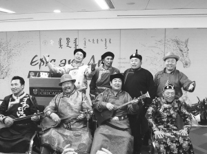 來(lái)自新疆的江格爾史詩(shī)傳承人在論壇現(xiàn)場(chǎng)集體彈唱《江格爾贊》。王珍攝