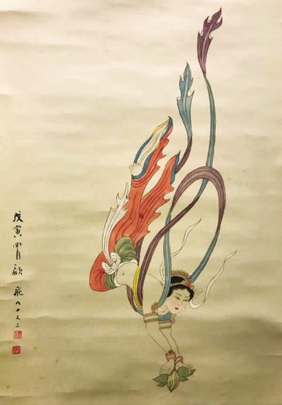 黃賓虹常常告誡學(xué)生,不要為外面的名利所誘惑,毀譽(yù)由人,毀譽(yù)不由人?!包S賓虹的教誨猶如一盞明燈照亮著她,也激勵著她?!鳖欙w的兒子裘吉透露,即使在最艱難的時期,母親也堅(jiān)持“日課”。“媽媽經(jīng)常半夜起床,開一只臺燈在畫畫。她有一個自訂的‘日課’表,每天幾點(diǎn)做什么事,畫山水、人物、花鳥、讀書看報一一寫明?!睋?jù)介紹,到了晚年,顧飛依然堅(jiān)持創(chuàng)作。讓人驚訝的是,本次展出的她九十多歲所繪工筆人物畫“飛天”系列,筆墨設(shè)色均精細(xì)之極,著實(shí)令人嘆服。