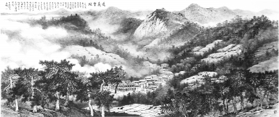 我沿著茶園的小路翻過一座小山,一組松樹霍然映入眼簾,沒想到,這個(gè)我擅長(zhǎng)畫的樹種“跑”來救急了。是啊,看那排排挺拔的青松,威嚴(yán)肅立,像戰(zhàn)士一樣守衛(wèi)著革命圣地,它是勝利的象征,也解決了我線性安排的難題。青松枝繁葉茂,水田隨山勢(shì)排列,山巒間的茶園長(zhǎng)短相接、方圓相依,連綿起伏,一下子解決了畫面結(jié)構(gòu)的問題,原本還是模糊的畫面逐漸清晰起來。白云映襯青松,青松環(huán)抱會(huì)址,民居散落山岡,茶園隨山勢(shì)緩緩展開……一幅壯美的山水畫卷呈現(xiàn)在眼前。形象清晰,方向明確,畫起來就非常順手,我以后的創(chuàng)作也進(jìn)展順利,一氣呵成。