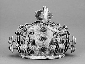該金鑲紅藍(lán)寶石冠高11.5厘米,底徑11厘米,重320克,呈半球形,由形似蓮花瓣的薄金片,內(nèi)外四層累疊而成。