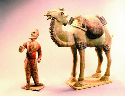 唐太宗昭陵陪葬墓鄭仁泰墓出土的牽駝彩釉陶俑,駱駝背上馱著兩卷絲綢(陜西省博物館收藏)。