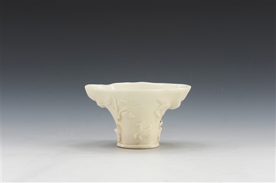 仿犀角杯是德化白瓷的常見(jiàn)器形,其造型源于飲酒所用的犀角杯。犀角杯在有明一代即是稀罕之物,曹昭《格古要論·珍奇論》中言:“犀角,出南蕃、西蕃,云南亦有。成株肥大、花兒好及正透者價(jià)高……凡器皿,需要雕琢功夫及樣范好?!薄睹魇贰ぞ砹摺ぽ浄分杏小岸?,六梁,革帶,授環(huán)犀,余同一品”的記載,即明朝二品官員的官服腰帶是由犀角制成,足見(jiàn)其材質(zhì)珍貴。以白瓷仿犀角,既得犀角之形,相對(duì)廉價(jià),又另呈一番瓷韻美感,不得不贊嘆德化制瓷藝人的獨(dú)具匠心。