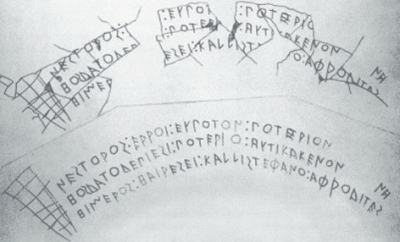 這個(gè)杯子上有三行銘文,銘文是片段的,因?yàn)楸拥囊恍┧槠瑏G失了。它用希臘字母的埃維亞早期形式寫成,從右到左分為三行,意思如下: