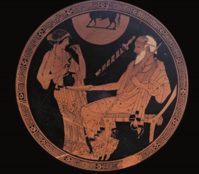 一只阿提卡杯的杯身圖像,展示了赫卡墨得為涅斯托耳調(diào)制美酒的場景,約制于公元前490年,意大利Vulci地區(qū)