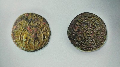 而借助強大的國力和絲綢之路的便利,貴霜王朝也對周邊地區(qū)的文化產(chǎn)生了一定的影響。本次展出的漢佉二體錢,是很好的例證。漢佉二體錢分大小兩種,為銅制,并非澆鑄,而是以打壓法制作,大小錢之間的重量比例大致為1:4。這種制造工藝和重量比例說明了漢佉二體錢是一種西方貨幣。然而,錢幣的圖案一面是類似貴霜丘就卻時期銅幣的動物,馬或駱駝;另一面卻標(biāo)示了古代中國的貨幣單位“銖”,大錢上環(huán)繞著漢字“重廿四銖銅錢”,小錢上的漢字“六銖錢”呈品字形分布。這種將兩種貨幣文化特點融于一身的漢佉二體錢,非常生動地體現(xiàn)了貴霜文化對古代喀什、和田地區(qū)的影響。
