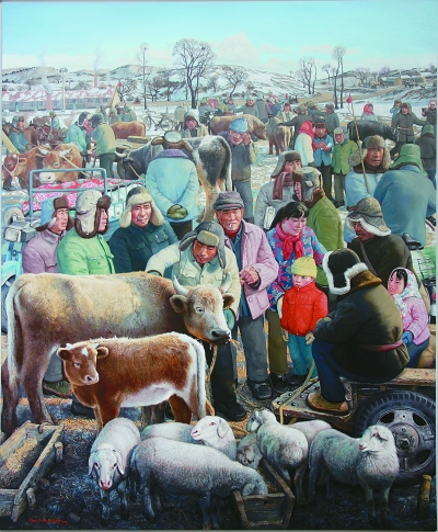野草灘的牛羊集市(油畫) 陳樹中