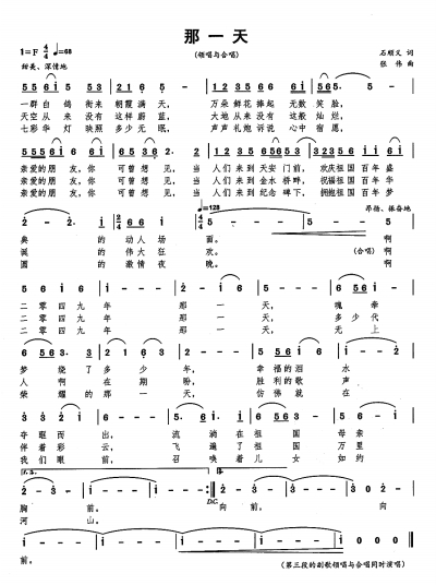 好的文藝作品往往是“取法乎上”的結(jié)果。在石順義和張偉的腦海中,喬羽、劉熾的經(jīng)典曲目《我的祖國(guó)》一直是他們“取法”的對(duì)象。《我的祖國(guó)》運(yùn)用了領(lǐng)唱加合唱的方式,具有穿透歲月的感染力。這種演唱方式在最近的主旋律歌曲中不太常見。《那一天》接續(xù)了《我的祖國(guó)》創(chuàng)立的演唱方式,領(lǐng)唱優(yōu)美抒情,合唱恢宏有力。