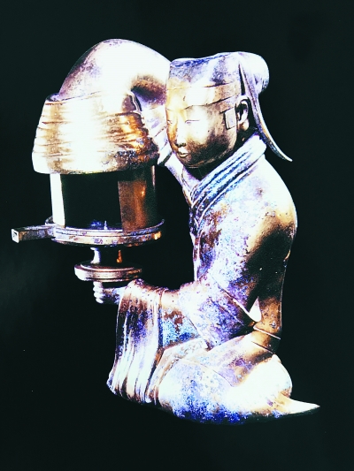 比如出土于2號墓的長信宮燈,外形是個宮女跪坐執(zhí)燈的形象,通體鎏金,作宮女跪坐執(zhí)燈狀,燈的各部分是分鑄而成,可以隨時拆卸,但是結(jié)合起來卻天衣無縫。它的燈盤可以轉(zhuǎn)動,燈罩在圓形軌道內(nèi)可以開合,能隨意調(diào)節(jié)光亮的大小和方向。宮女的體內(nèi)中空,燭火的煙滓可以通過宮女的右臂進入體內(nèi),使煙滓停滯在燈身中,用以保持室內(nèi)的清潔。這件文物在美國展出時,前國務(wù)卿基辛格連聲驚嘆:中國人在兩千年前就有環(huán)保意識,中國了不起。
