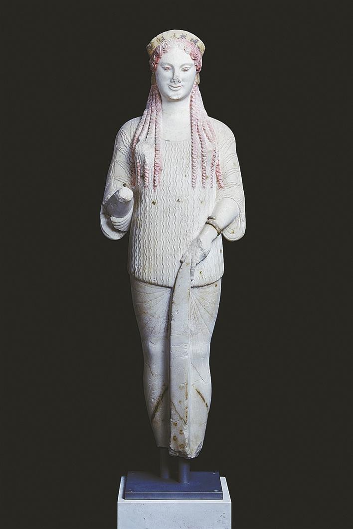 科拉雕像(公元前520—前510年),高1.15米,由大理石制成。公元前7世紀(jì)中葉,隨著古希臘文明與地中海東岸和埃及文明的聯(lián)系與交流,在希臘出現(xiàn)了用硬質(zhì)材料雕刻的等身雕像和比真人更大的雕像。庫羅斯和科拉,意為少年和少女的大理石雕像,是希臘古風(fēng)時期第一批獨(dú)具特色的雕像。在衛(wèi)城的考古發(fā)掘過程中,發(fā)現(xiàn)了超過200尊科拉雕像,從而使衛(wèi)城博物館這個門類的收藏量冠絕全球。
