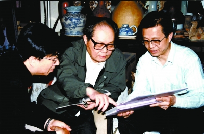 馮其庸(左)翻看周宏興(右)出版的大理石畫冊連稱神奇