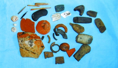 在北堡寨村拾得的彩陶、石器、骨器、蚌器的殘片和遺物。
