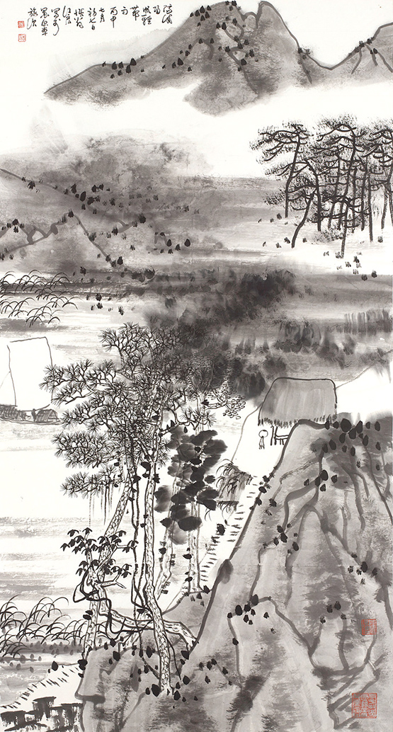 但他依然有著海派的優(yōu)越和優(yōu)雅,從容典雅,長(zhǎng)松流瀑、遠(yuǎn)山近水、奇峰行云,都是以名士之風(fēng)敘述描繪,娓娓道來,曲徑通幽。他拓寬了海派的疆域,豐富了海派的內(nèi)涵,把他江宏的性情在紙上渲染,用他精到的筆墨,寫山水大風(fēng)景、作人生大文章,把他藝術(shù)的審美和生命的體驗(yàn)表現(xiàn)得淋漓酣暢,爽了自己,也打動(dòng)了別人。