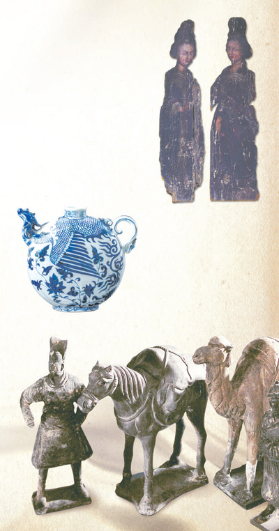 上圖:新會木美人,明代。兩個穿著中式服飾的西洋美人。 廣東新會博物館供圖 中圖:景德鎮(zhèn)窯青花鳳首扁壺,元代。所繪圖案為一只鳳凰昂首奮飛,在意大利服飾和繪畫中也有大量中式鳳凰圖案。 首都博物館供圖 下圖:陶俑,元代。絲綢之路上的一支商旅隊伍。 內(nèi)蒙古博物院供圖