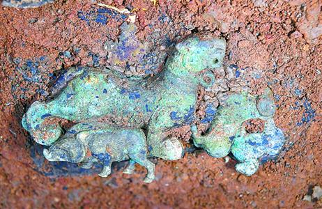 李存信介紹說,現(xiàn)階段清理出的馬蹄金共兩塊,分別位于墓主身側,體量較小,正好可供孩童握在手中。青銅小罐不足十公分,推測是用來盛放水或者砂石進行玩耍的。還清理出一個裝著4件微型青銅獸的盒子,盒子已破損嚴重,青銅獸分別為虎、大角羊、野豬、綿羊;其中虎型青銅獸疑似為漢代玩具車,虎爪下有輪,虎脖子下方有孔可穿繩,可供人力牽引。