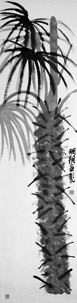那次去朋友家,已喝了酒,有點酒意,一進(jìn)門迎面就看到了齊白石老先生六尺整張的《棕櫚圖》,畫得真是好,讓人想下拜。就筆墨而言,畫棕櫚可以說是諸法具備??莨P,濕筆,淡墨,焦墨,拉線,揉搓,各種的筆法都在里邊,各種的墨法也都在里邊??瓷先ブ皇且恢曜貦?,細(xì)看真是讓人越看越想看。中國畫,大多有美好的寓意在里邊:畫一只喜鵲落在梅花上是“喜上梅梢”,畫一條大鲇魚,是“年年有魚”,而棕櫚則是“忠實伴侶”——我們都希望自己永遠(yuǎn)做愛人的忠實伴侶。