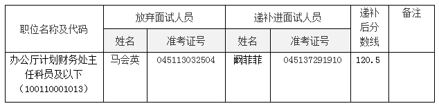 因部分考生自愿放棄面試資格,根據(jù)公務(wù)員招考有關(guān)規(guī)定,擬在公共科目筆試合格的考生中,按照筆試成績(jī)從高到低的順序遞補(bǔ)面試人員。具體情況如下: