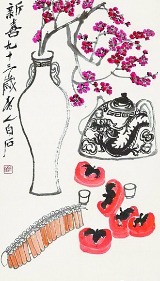 在齊白石筆下,傳統(tǒng)的“歲朝圖”便更多了些世俗煙火之氣。眾所周知,齊白石有一套本事,便是為“萬(wàn)蟲(chóng)寫(xiě)照,百鳥(niǎo)傳神”,許多在前人看來(lái)不入畫(huà)的東西在他的作品里都有表現(xiàn)。其《歲朝圖》也是如此,牡丹、水仙、柿子這些吉祥花果在他的畫(huà)里依然常見(jiàn),而前人少畫(huà)的燈籠、爆竹、茶壺等物什也成了他畫(huà)里的主角。且看齊白石作于93歲的《歲朝圖》,瓶中幾枝紅梅嬌艷可人,再配上幾顆紅柿子、一串紅爆竹、一只龍紋壺、兩盞素茶杯,既有吉祥如意之愿,又有日常生活之趣,尋常百姓家的年味兒躍然紙上。畫(huà)題“新喜 九十三歲老人白石”,足見(jiàn)畫(huà)家當(dāng)時(shí)的喜悅心境。是年,北京文藝界專(zhuān)門(mén)為齊白石召開(kāi)祝壽大會(huì),周恩來(lái)總理親自出席宴會(huì),對(duì)這位畫(huà)壇耆宿給予了極高的禮遇??梢?jiàn),齊白石此幅《歲朝圖》不但接地氣、有年味兒,更寄托了古木新枝、老當(dāng)益壯的美好愿景。