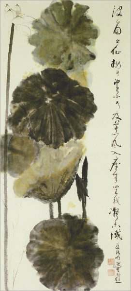 素有“饒荷”之譽(yù)的饒宗頤的荷花,論幅面有巨幛,也有尺幅,但不管是水墨,還是設(shè)色,所表現(xiàn)的荷花精神,尤其是荷花與他學(xué)問中的敦煌學(xué)、佛學(xué)、禪學(xué)都有著重要的關(guān)聯(lián)。作為文人思想在畫面上的一種特別的表達(dá)方式,饒宗頤不止于此,他還常常配以對(duì)聯(lián), 《荷花八條屏》以對(duì)聯(lián)“竹雨松風(fēng)荷月,茶煙琴韻書聲” ,傳達(dá)了文人的意趣,超越了物的對(duì)象。荷花作為一種文化符號(hào),在饒宗頤的繪畫世界中,得到了盡情地表現(xiàn)。他經(jīng)常不滿足于傳統(tǒng)文人的方式,不斷變換語言和形式而求得自我風(fēng)格的展現(xiàn)。同時(shí),他還以傳統(tǒng)文人的習(xí)性,通過文人所鐘情的內(nèi)容來構(gòu)想新的畫作。如《五湖秋色》在無量壽佛(中國畫) 饒宗頤荷花荷葉間畫五把不同造型且不同顏色的茶壺,而這之中不同的顏色與不同的造型正是“五湖”所內(nèi)涵的多樣的特色。