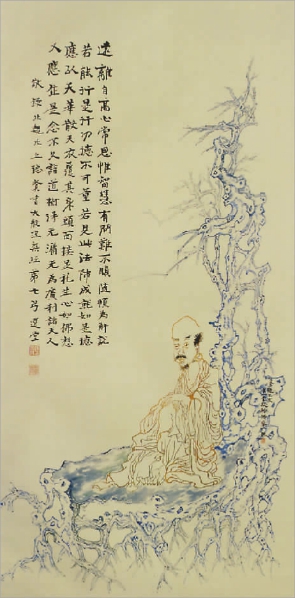 在文人畫的各種題材中,作品所表現(xiàn)的文人的生活方式也是重要的內(nèi)容,文人的懷古、尋古、鑒古,發(fā)思古之幽情,常常出現(xiàn)在畫面中而表現(xiàn)出特別的文化內(nèi)涵。在饒宗頤一生多樣的學(xué)問中,敦煌學(xué)的成果最為耀眼——1978年,出版了《敦煌白畫》 ; 1983年到1986年間還主編了《敦煌書法叢刊》共29冊(cè); 1990年創(chuàng)辦《香港敦煌吐魯番研究中心叢刊》 ,出版了《敦煌琵琶譜》 ,同時(shí)還發(fā)表了《圍陀與敦煌壁畫》 《敦煌石窟的尼沙》 《劉薩訶事跡與瑞像圖》 《敦煌白畫導(dǎo)論》 《跋敦煌本白澤精恠圖兩殘卷》等論文。在敦煌和西域地區(qū)的考察中,饒宗頤不僅畫了一些“西北宗”題材的畫作,表現(xiàn)了他對(duì)西北山水的特別感覺,還在研究敦煌書法和壁畫的基礎(chǔ)上,挖掘敦煌白畫資源,尋找壁畫中感興趣的內(nèi)容,創(chuàng)作了一批屬于他自己的敦煌題材的作品。他以敦煌壁畫為原始素材,選取其中的形象作為獨(dú)立單元,用白描法畫出形象,往往使用金墨勾線,或成為線描,如取莫高窟314號(hào)隋窟藻井上的菩薩造型而成的《蓮座菩薩》 ;或配景,以表現(xiàn)佛、菩薩與現(xiàn)實(shí)人間景象的關(guān)系,如《無量壽佛》 ,以及參照“敦煌盛唐思維菩薩畫像”而成的《思維菩薩》 。這些來自敦煌的佛與菩薩,如果失去了學(xué)術(shù)支撐,就不可能有它特別的意義?!耙远鼗桶桩嫻P意,合元人墨法” ,寫《松竹如來》 ,同樣是饒宗頤的另外一種想法。所謂的融通,還包括在專業(yè)方面的由此及彼,觸類旁通。