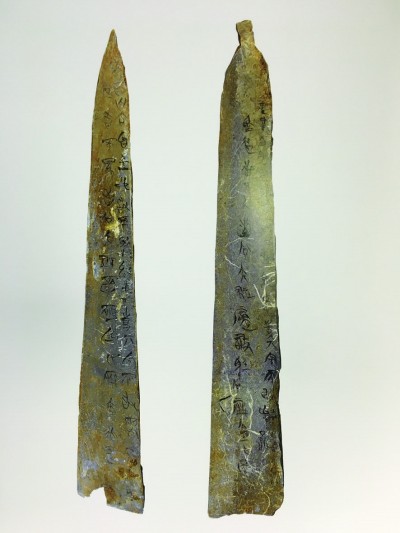 在鑒壺旁,擺了一組山西出土的“侯馬盟書”及河南出土的“溫縣盟書”,都是當(dāng)時晉國卿大夫之間舉行盟誓用誓詞。展覽說明寫道:“據(jù)《春秋》記載,242年內(nèi)諸侯國之間朝聘盟會多達(dá)450次,反映了諸侯國之間、公室與卿大夫之間、卿大夫相互之間,為重新劃分利益訂盟誓而破壞原有禮制的事實。”馬今洪說,春秋時期經(jīng)常會盟,通常召集人即是盟主,盟主就是“老大”,最為人熟知的五個“老大”是春秋五霸。訂盟書的意義在于規(guī)定利益邊界,主要是為了盟主的利益,“老大吃肉,小弟喝湯”。