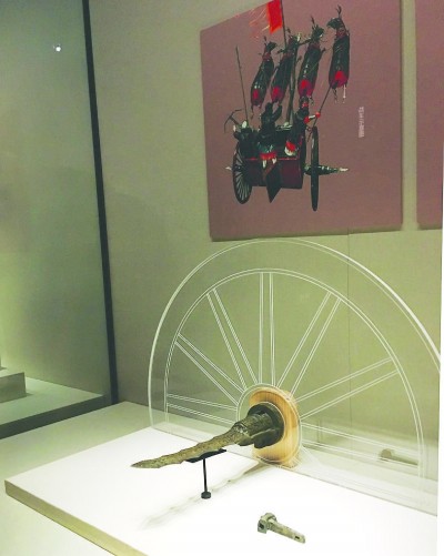 繞到下一個展廳,只見一個模擬的半個戰(zhàn)車車輪的車軸位置,豎插著一把劍似的物件。“這就是當(dāng)年的‘大規(guī)模殺傷性武器’。”熊建華介紹,這是戰(zhàn)車上的矛狀車軎,1978年出土于湖北隨縣曾侯乙墓。矛狀車軎在使用時,軎轄朝上,矛葉與地面平行,在戰(zhàn)車行進(jìn)時,可殺傷車旁之?dāng)场!霸趹?zhàn)國時代,為提高戰(zhàn)斗力和殺傷力,各類兵器與防御裝備都在迅速改進(jìn)。”