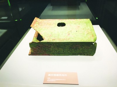 往前走,只見展柜中陳列著不少建筑構(gòu)件,如陶瓦、瓦當(dāng)、陶水管等,來自春秋戰(zhàn)國時期的各個都城。據(jù)《鹽鐵論·通有》:“燕之涿、薊,趙之邯鄲,魏之溫、軹,韓之滎陽,齊之臨淄,楚之宛陳,鄭之陽翟,三川之二周,富冠海內(nèi),緣為天下名都?!痹俳Y(jié)合這些年對都城城址的考古發(fā)現(xiàn),可證當(dāng)時都城的繁華。記者看到,在展柜中陳列著幾件青銅建筑構(gòu)件,有曲尺形的,有楔形的,有方筒形的。馬今洪介紹,其中的曲尺形銅建筑構(gòu)件,是目前發(fā)現(xiàn)時代較早的銅質(zhì)建筑構(gòu)件。這些銅質(zhì)建筑構(gòu)件一般用于連接枋、梁,主要起加固和裝飾作用。據(jù)展覽說明,由于色澤金黃,這些銅質(zhì)構(gòu)件又被稱為“黃金鋼”。這批建筑構(gòu)件的出土地陜西鳳翔,先秦時期屬于秦都雍城的范圍?!澳阆胂肟?,整個房子金光燦燦,當(dāng)時的雍城多壯觀??!”
