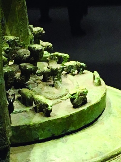 “這個銅盉借調(diào)到上海博物館展出時,我曾經(jīng)仔細(xì)看過,非常有意思。”馬老師把我們帶到一個中心展柜前,內(nèi)中展示的是由浙江省博物館送展的“螭紋提梁銅盉”。定睛看器蓋,只覺好似走進(jìn)了動物園,上面立體地雕塑了犀牛、大象、老虎、熊、鹿等獸類,足有16只。在這些動物四周,堆塑著11條形態(tài)似蛇的螭龍,有的正在大快朵頤,有的昂首好似在下咽,有的豎起上身像在尋找獵物?!澳憧?,這條螭龍在吃什么?”見記者似乎迷失在“動物園”中,馬老師靈機(jī)一動,掏出手機(jī)選好角度“咔嚓”一聲,而后指著手機(jī)屏幕道,“就是這條,你看它在吃什么?”熊建華問:“是不是青蛙?蛇吞蛙的主題很常見。”馬老師搖搖頭:“你們看,這眼睛瞪得大大的,嘴巴張開,高舉雙手……這是個人,他的腳已經(jīng)被螭龍吞啦!”聽到這兒,熊建華興奮起來:“你說,這會不會就是 ‘饕餮紋’的立體形象呀?”
