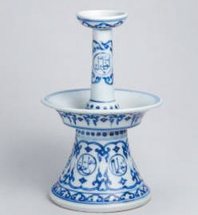 這是一件明正德年間的青花燭臺。燭臺很復(fù)雜,由四部分組成,最上端為蠟燭插口,外壁繪如意云頭紋;其下為燭臺細長支柱,中部繪圓形開光,開光內(nèi)書寫阿拉伯文,上下分別繪勾蓮花枝紋及菱形紋。再下為承托圓盤,也繪如意云頭紋;最下端為喇叭形臺座,也繪圓形開光,開光內(nèi)書寫阿拉伯文,開光上下分別繪勾蓮花枝紋及菱形紋。燭臺上的阿拉伯文與傳統(tǒng)紋飾,表現(xiàn)出阿拉伯文化與中華傳統(tǒng)文化的交融。