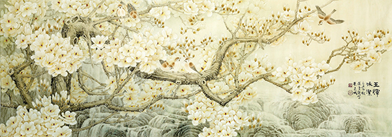 我讀陳奕純的《玉輝冰潔》,所傾情顛倒者,正是這戛戛乎獨(dú)造的意境。我很少見過畫玉蘭花的有如此浩浩蕩蕩之氣勢(shì)。大尺寸里的這個(gè)畫面,大開大闔,洋洋灑灑的揮灑,潑出了無限的希望,故觸手而生春,點(diǎn)墨即有情。于是,盎然的春光浮漾下,春情動(dòng)矣,春色無邊,誠(chéng)有不可言之妙者,然何嘗能道其一二乎?只有擊節(jié)而贊曰:好!于美妙之藝術(shù)作品,有時(shí)言語都是多余的,這當(dāng)然需要我們?nèi)ハば牡芈w會(huì)了。