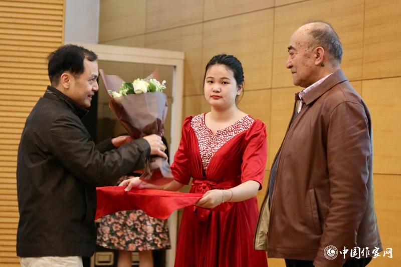 石一寧為獲獎(jiǎng)作家伊明·艾合買提頒獎(jiǎng)