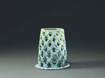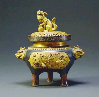 展覽中,年代最早的一件展品是戰(zhàn)國時期的絡(luò)紋熏。據(jù)考證,這應(yīng)是一種與熏爐配套使用的熏籠。有記載顯示,早在漢代,熏香已經(jīng)在貴族中廣泛流行,出現(xiàn)了專門用于熏香的熏爐,以及能直接放在衣物中用來為衣服、被褥熏香的熏籠。唐以后,熏籠的使用更為盛行,詩人白居易 《后宮詞》 中便有“紅顏未老恩先斷,斜倚熏籠坐到明”的詩句。而許多畫家也曾用畫筆描繪閨閣、僧道、文人的用香情景。比如,此次展出的陳洪綬的 《斜倚熏籠圖》 堪稱明代生活用香的經(jīng)典之作:美麗的女子斜身倚靠熏籠,裙裾招展,熏籠下放置一鴛鴦形香爐。古人不僅以詩書畫詠香,更發(fā)揮聰明才智,打造出各式各樣的香具。展出的一件清代的透雕鎏金爐,便是其中的代表。這個香具做工十分精美,蓋頂飾一獅子,蓋面隆起為鏤空的纏枝花紋。這件器物同時運用了錯金和鎏金兩大工藝,器表經(jīng)過特殊處理呈現(xiàn)三種不同的顏色。蓋底部有款識“造辦處制”,乃是專供內(nèi)廷和皇家使用的器物。