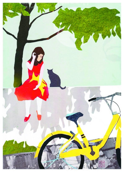 除了展現(xiàn)自身經(jīng)歷的拼貼畫,梁霄飛還有不少得意之作。《貓》、《傘》等帶有倒影的作品,都反映了他對當(dāng)下時(shí)代的個(gè)人態(tài)度,呼吁人們面對困難和未知的世界時(shí),依舊要勇敢地前行,要培養(yǎng)定力,不要迷失在過度“文明”的叢林中。