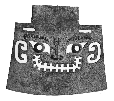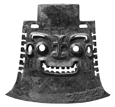 商周時期的青銅器極少只有人頭紋飾而沒有軀體的,而這兩件銅鉞僅透雕有猙獰怪神的頭部,其目的應(yīng)該是起到一種震懾的作用。類似的青銅鉞在河南西周時期的墓葬中也有發(fā)現(xiàn),收藏家陳仁濤將其解讀為戰(zhàn)神蚩尤紋。雖然此說法尚需考證,但由此我們可以知道,“鉞”和戰(zhàn)爭有著緊密的聯(lián)系。