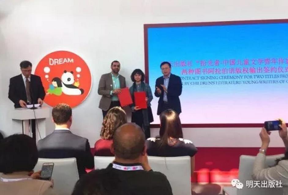 明天出版社與阿聯(lián)酋的庫(kù)坦出版社(Kuttab Publishing Company)合作,簽訂青年作家舒輝波的中篇小說(shuō)《聽(tīng)天使唱歌》、劉玉棟的中篇兒童小說(shuō)《月亮舞臺(tái)》、龐婕蕾的兒童生活故事《我是大夢(mèng)想家》的阿拉伯語(yǔ)的版權(quán)輸出合同。