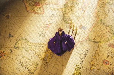 紫色一直被認(rèn)為是一種彰顯霸氣的顏色,為歐洲皇室和貴族所偏愛。在電影《伊麗莎白:黃金時代》里,伊麗莎白一世的霸業(yè)初成時,站到一幅展開的世界地圖上,她的臉沒有正面出現(xiàn)在畫面上,在俯拍鏡頭下,觀眾看到一襲浮華的紫色綢緞禮服裙,巨大的裙擺覆蓋了女王腳下的大海和大陸。