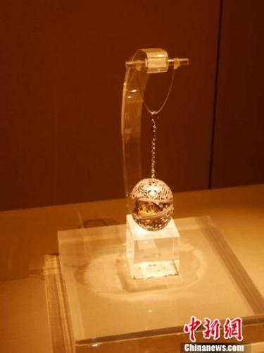 葡萄花鳥紋銀香囊,是唐朝的文物,出土于西安市南郊何家村,囊外壁用銀制,呈圓球形,通體鏤空。別看香囊小巧,但構(gòu)思巧妙,其內(nèi)設(shè)兩層雙軸相連的同心圓機(jī)環(huán),外層機(jī)環(huán)與球壁相連,內(nèi)層機(jī)環(huán)分別與外層機(jī)環(huán)和金盂相連,內(nèi)層機(jī)環(huán)內(nèi)安放半圓形金香盂。外壁、機(jī)環(huán)、金盂之間,以鉚釘鉚接,可自由轉(zhuǎn)動,無論外壁球體怎樣轉(zhuǎn)動,由于機(jī)環(huán)和金盂重力的作用,香盂總能保持平衡,里面的香料不會灑落。相傳唐玄宗在馬嵬驛賜死楊貴妃,后來重返此地思念之情難卻,密令改葬,發(fā)現(xiàn)當(dāng)時被一同埋葬的香囊還完好無損。
