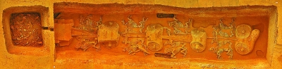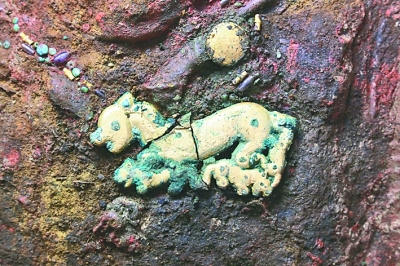 “故郡墓葬的車馬坑最值得一提?!睆埓洪L說,車馬坑在河北省本就罕見,至今發(fā)現(xiàn)也不過數(shù)座,而要論保存最佳,故郡車馬坑可拔頭籌。五輛車串排的陣列,漆彩貼金的車輿,華美絕倫的絡(luò)轡,代表了墓主人的尊貴身份。殉犬帶有項圈銅環(huán),體現(xiàn)了主人對車馬犬的珍視。宏大的規(guī)模是墓主人地位、財力和控制力的真實映射?!把橙爽F(xiàn)象和殉牲坑昭示著迥異中原的戎狄風(fēng)俗?!?/p>