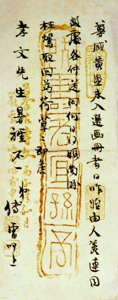目前汪己文先生轉(zhuǎn)來法繪,拜謝之余極佩先生筆法墨韻,不獨深得賓翁神髓,亦且上追宋元明末諸賢,風(fēng)格超邁,求諸當(dāng)世實不多覯。吾國優(yōu)秀藝術(shù)傳統(tǒng)承繼有人,大可為民族前途慶幸。惟大作近景用筆倘能為緊湊簡化,則既與遠景對比更為顯著,全幅氣象亦可更為渾成。溥心畬先生平生專學(xué)北宗,刻劃過甚姑勿論,用筆往往太碎,致有松率之弊。不知先生亦有同感否?