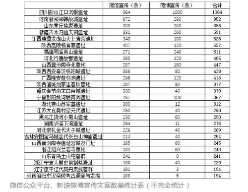 在“2017年度全國十大考古新發(fā)現(xiàn)”前一天,這篇文章對26項(xiàng)入圍“2017年度全國考古十大新發(fā)現(xiàn)”項(xiàng)目的網(wǎng)絡(luò)宣傳文案數(shù)量進(jìn)行了統(tǒng)計(jì)。胡宇煊在統(tǒng)計(jì)了微信公眾平臺(tái)、新浪微博宣傳文案數(shù)量后,對這26個(gè)項(xiàng)目進(jìn)行排序,并大膽預(yù)測了2017年度全國考古十大新發(fā)現(xiàn)的評選結(jié)果。