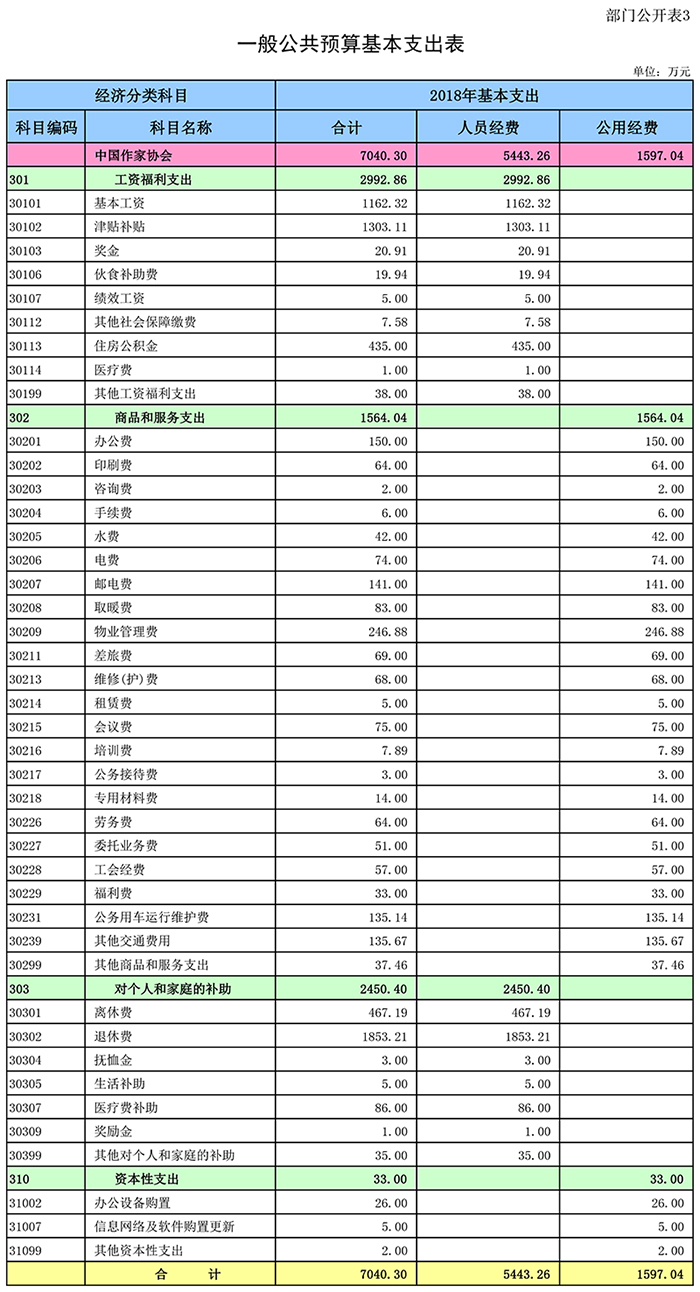 中國作家協(xié)會2018 年一般公共預(yù)算基本支出 7040.30萬元,其中:
